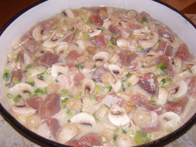 В тава слагаме нарязаните гъби, свинското месо, сметаната, зеления лук и подправките. Наливаме около 300-400 гр вода и оставяме във фурната да се пече до готовност. Желателно е месото да е от младо животно, за да не трябва да се приготвя дълго!